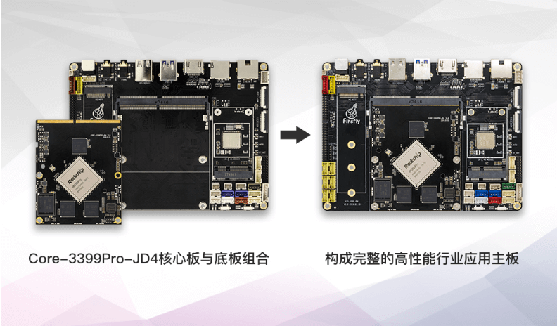 核心板与底板组合,构成完整的高性能行业应用主板,扩展接口更丰富,性能更强大,可直接应用到各种智能产品中,加速产品落地。